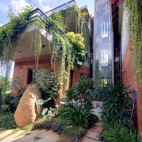 For example as you walk the climb you come across Bauhinia tomentose, just plucking the leave and smelling this spice is an experience, as you go along further on the entrance walkway you will find the betel palm tree with pepper climber at the bottom, traditional grown together as a cultivation crop, finds place in this garden, simply because it make us nostalgic driving along the vast field of the countryside. Further as one reaches the entrance porch of the residence, you will come across Carissa carandas is a species of flowering shrub found in Coastal districts Karavali of Karnataka. It produces berry-sized fruits that are commonly used as a condiment in Indian pickles and spices, as the family was from konkan, our design found a place for this plant.